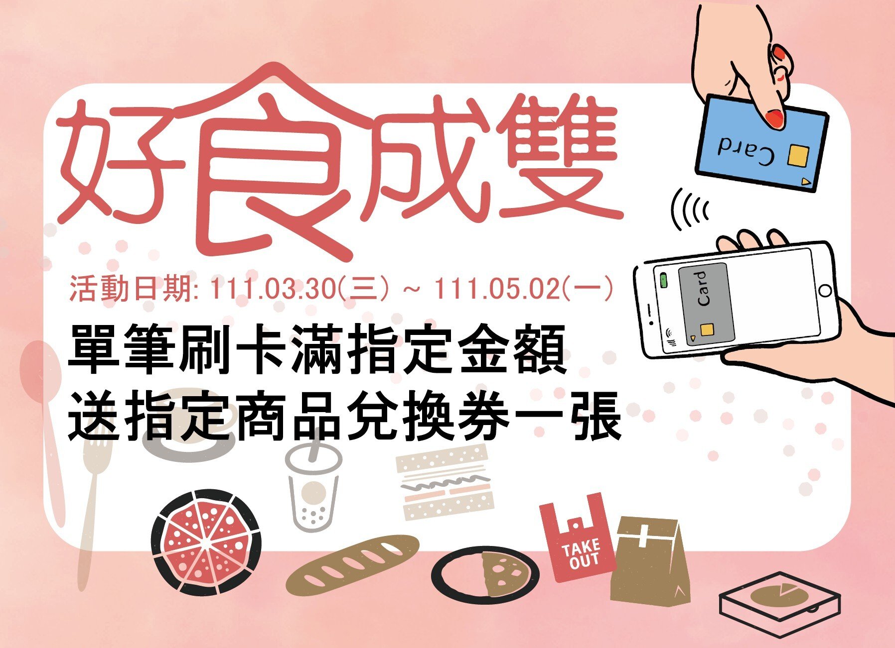 1.兌換券限下次使用,需於111/05/06前使用完畢,逾期無效,每張兌換券限兌換乙次。2.兌換券不適用於電話預約、外送、線上點餐等服務,亦不得與其他優惠活動併用,兌換完畢請交由服務人員回收,不得折抵現金或退款。3.兌換券需妥善保管,遺失或損毀恕不補發,塗改、影印、逾期及偽造皆無效。4.聯卡中心及活動店保有隨時修改、變更或終止本活動之權利,並於聯卡中心官網上公告。
