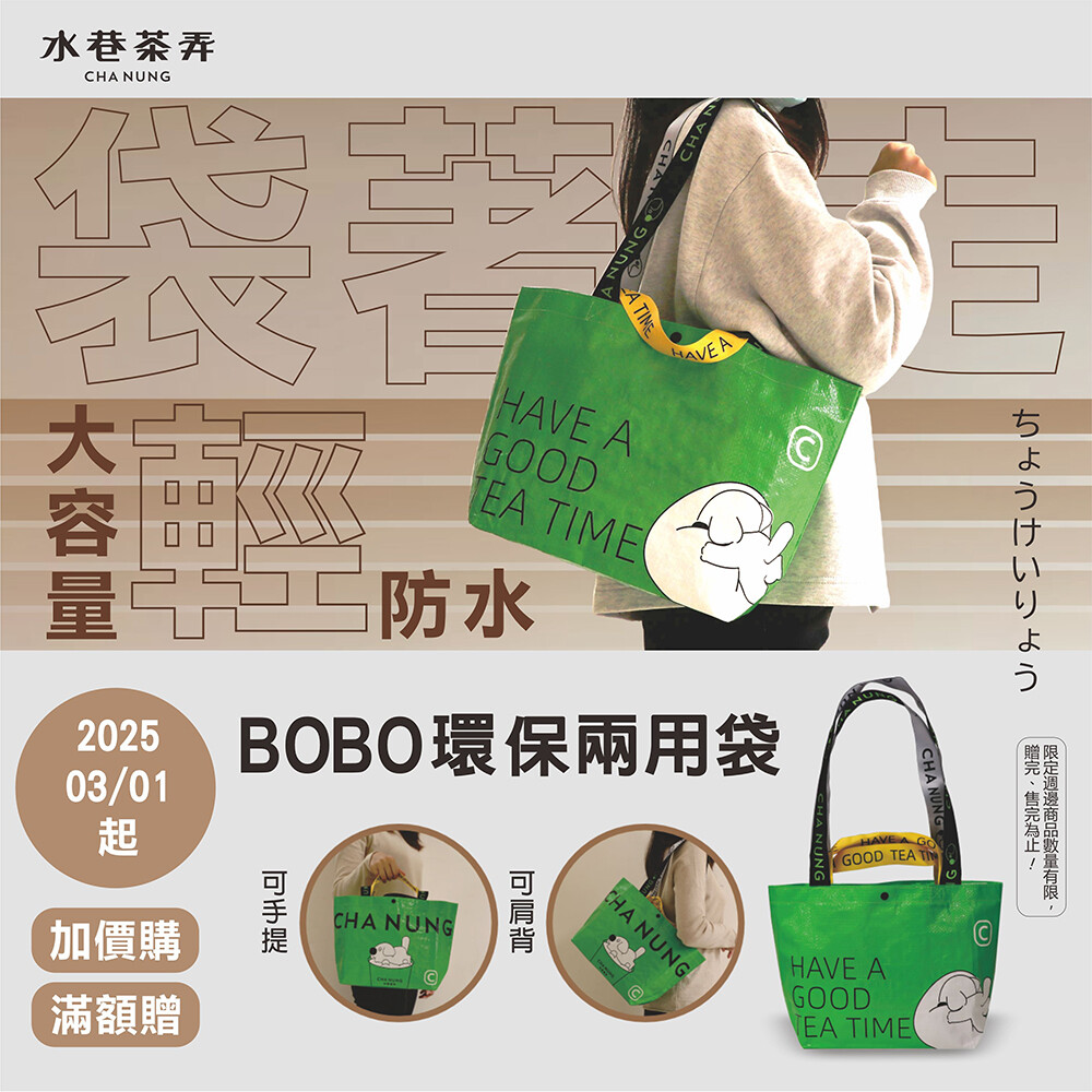 𝟯/𝟭起快到全台門市袋著走~水巷茶弄特製可愛𝗕𝗢𝗕𝗢環保兩用袋,長帶肩背短帶可手提,極輕量防水耐汙材質,摺疊收納不佔空間,重複使用更環保♻️